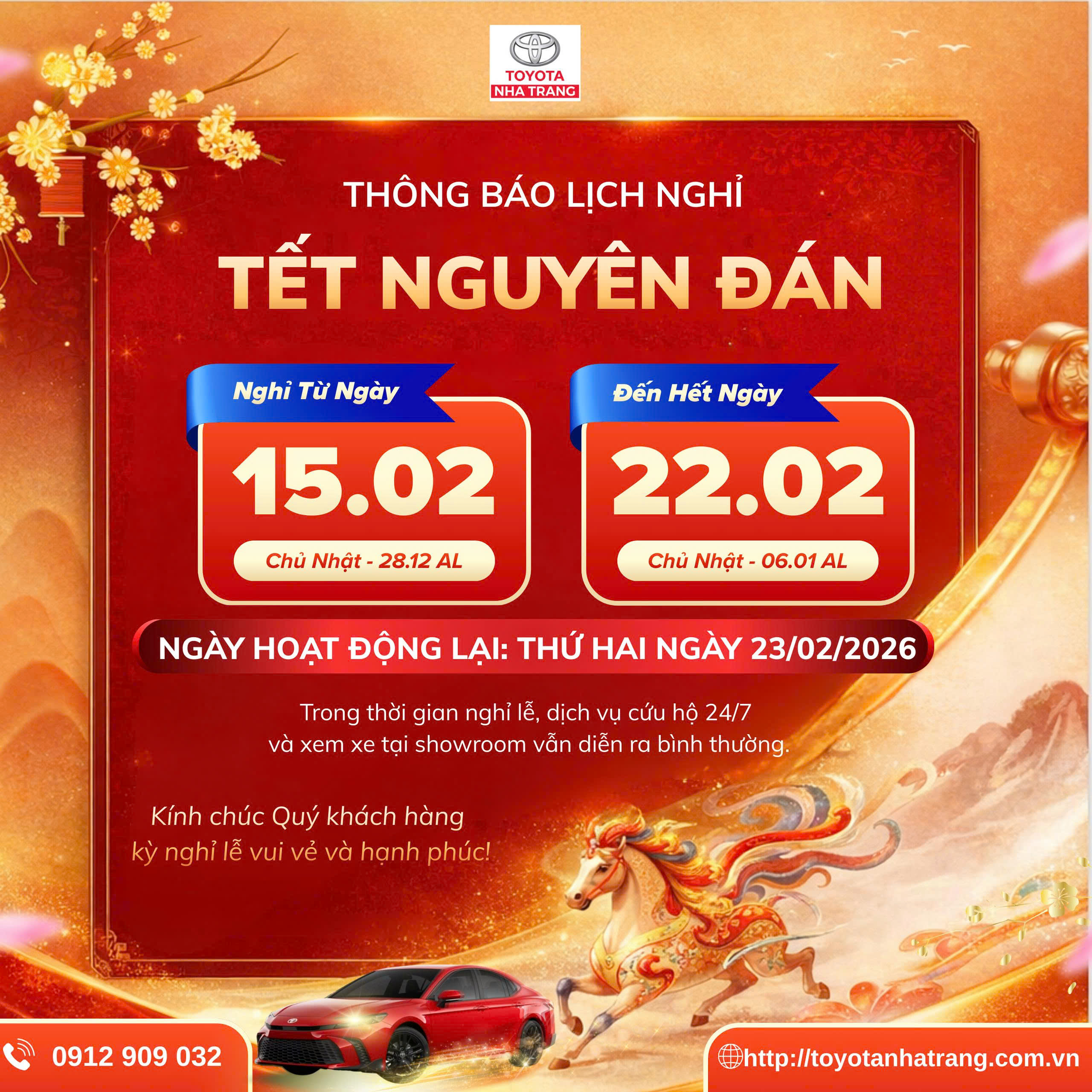 Toyota Nha Trang xin trân trọng thông báo lịch nghỉ Tết: Thời gian nghỉ: Từ ngày 15/02/2026 đến hết ngày 22/02/2026