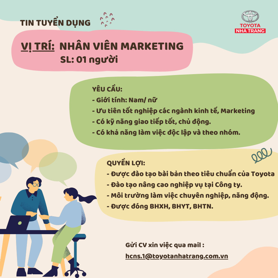 - SĐT : 0354604777- Gửi CV xin việc qua mail : hcns.1@toyotanhatrang.com.vn- Hoặc gửi hồ sơ trực tiếp tại Công Ty CP Toyota Nha Trang